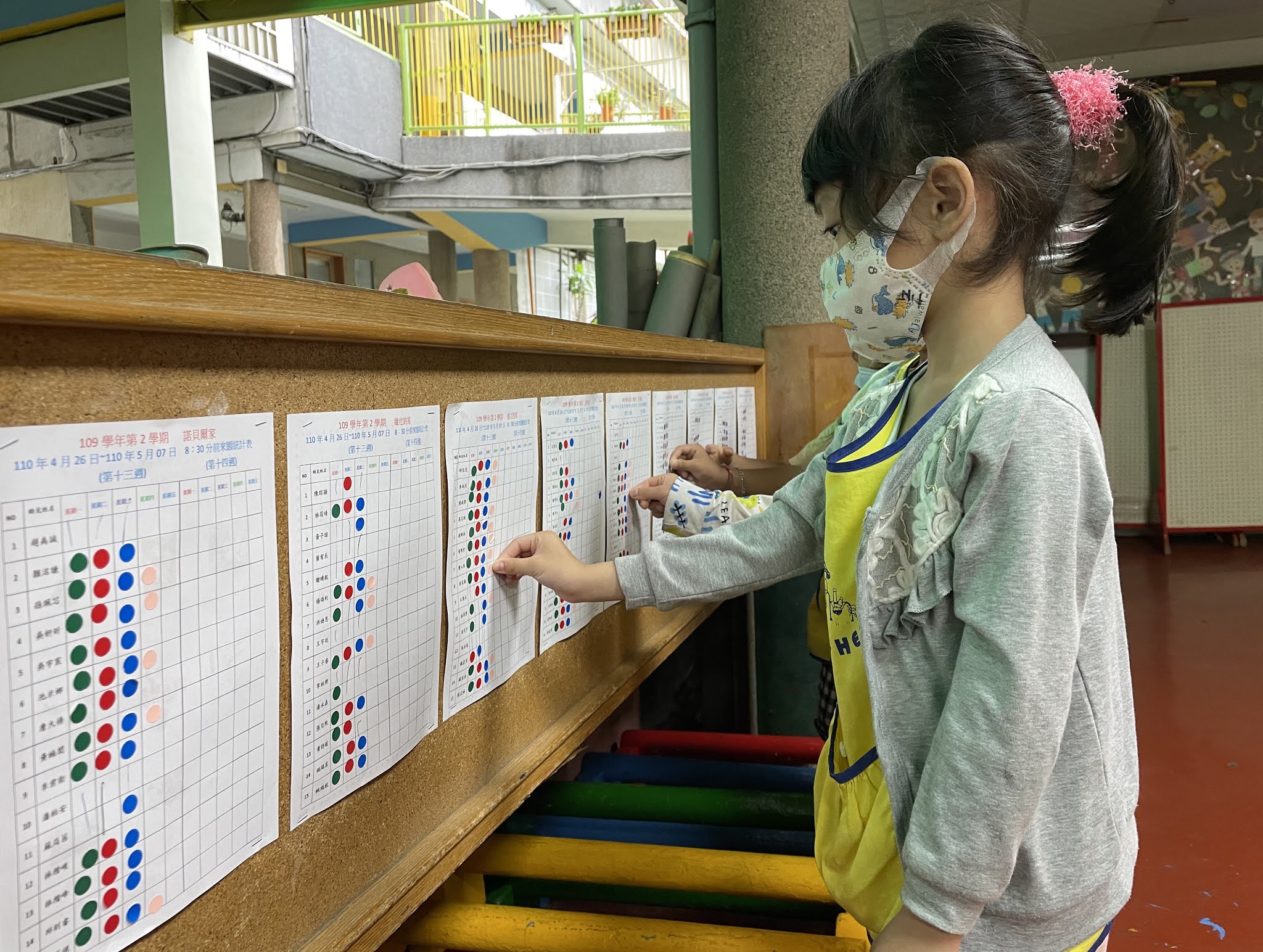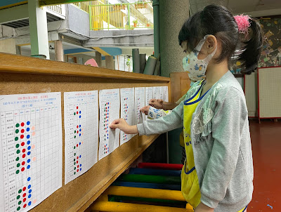 多數小孩已養成八點半前來園的好習慣,不因下雨而晚到。八點半的圓點,每天都有七成以上的小孩領取,呼應弟子規的朝起早,夜眠遲,每天要早起,不要熬夜;提醒小朋友,不要為了拿圓點沒睡飽,一定要睡足九到十個小時,扣掉午休的一小時,晚上至少要睡八到九小時;幾點上床呢?告訴小朋友,以起床的時間往前計算,若早上七點起床,睡九小時,最慢十點就要睡著,九點半得上床,沒睡飽,會沒精神,也會長不高。