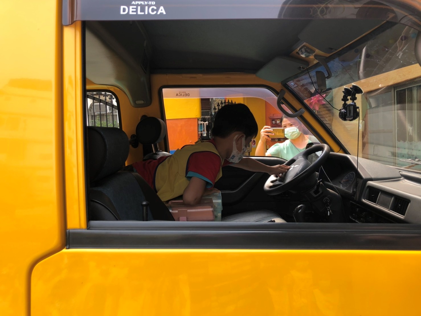萬一不小心被關在車內時,該如何自救?小朋友很清楚的說:「拍打窗戶、開窗呼叫或按喇叭。」最後,搭車實際體驗,透過影片欣賞加深印象。