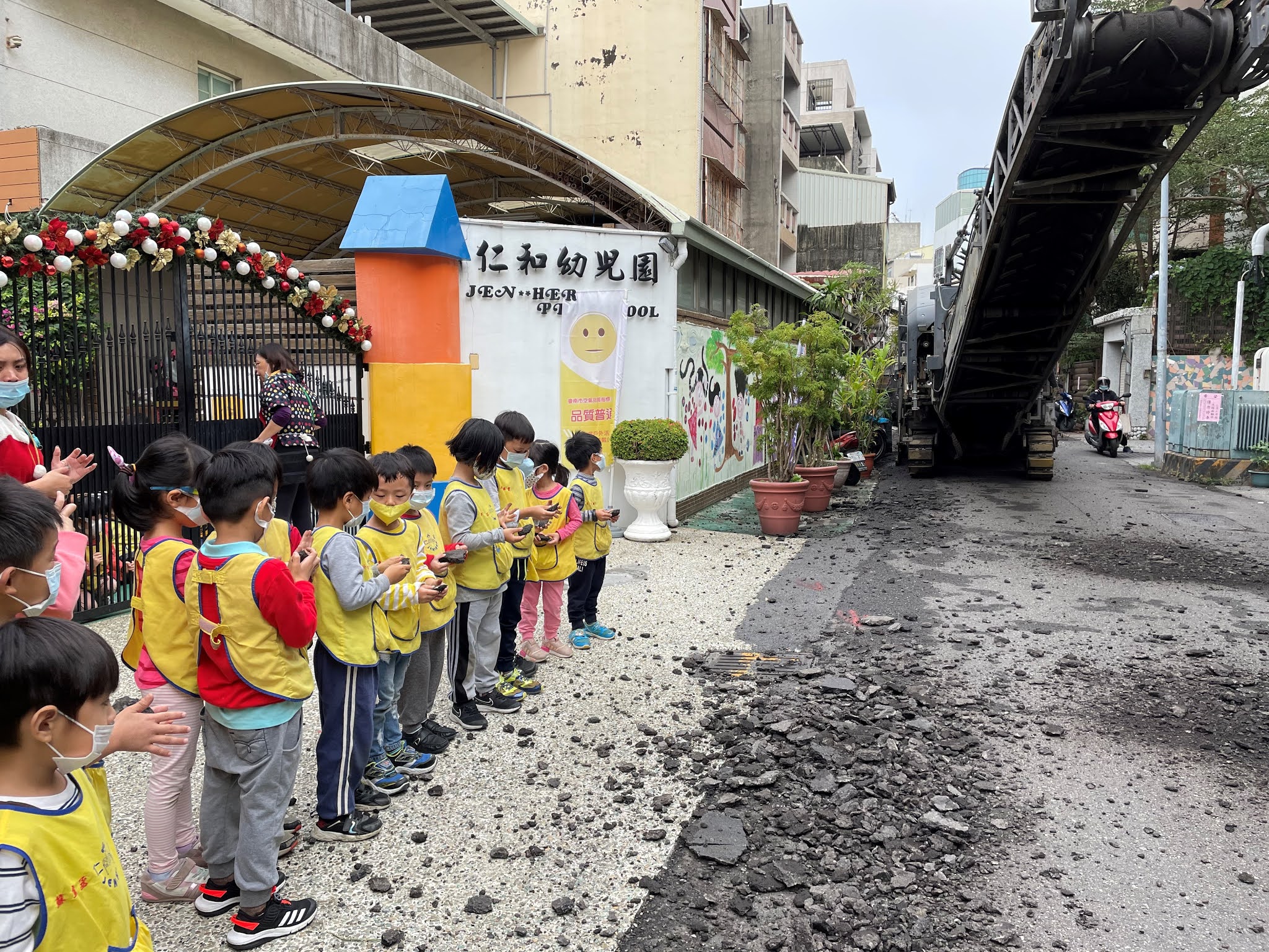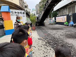 週四前門230巷路面進行翻修,難得的機會,讓大中班小孩到前門觀看路面刨除的工程,袍土機刨除和山貓機具掃地的情形;對居住在都市的女性老師和小孩,可是難得的經驗。孩子們連連的驚呼聲、掌聲,給予現場工作者的肯定與感謝。今日鋪瀝青,孩子還是很興奮。