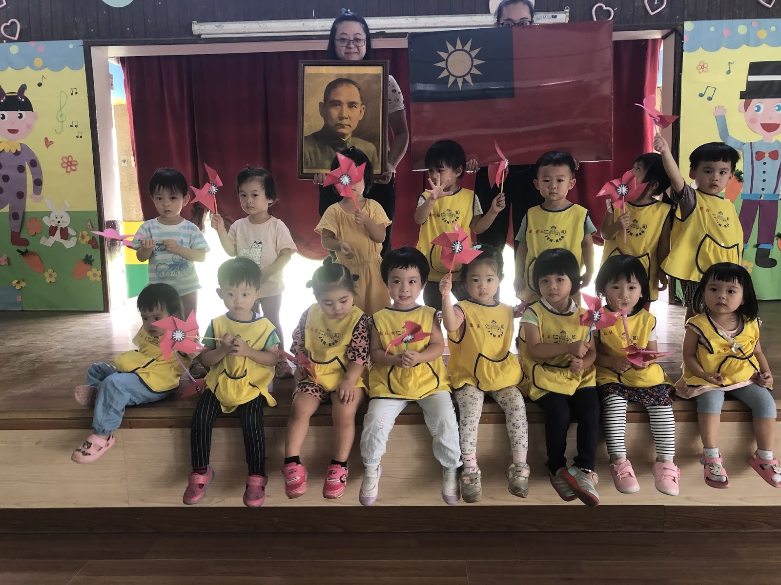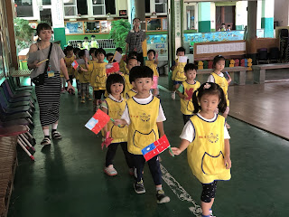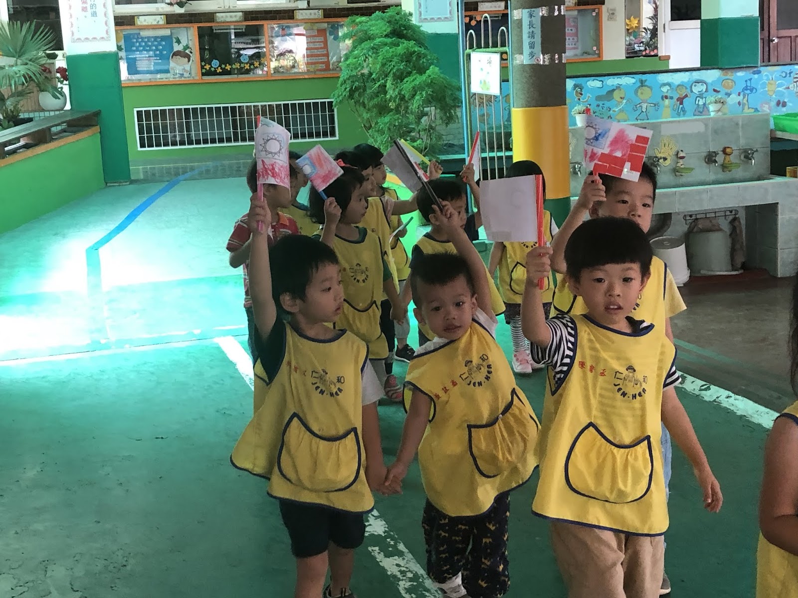 今早小班和幼班老師,讓小朋友體會拿自製國旗遊行的樂趣!