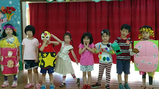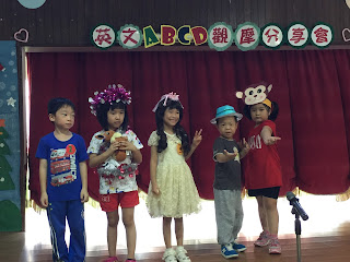 英文故事分享會,大中小每班各推派二人上台,孩子們經過了一段時間的準備,臨場的模擬,胸有成竹的以為大家都喝足了勇氣湯;然,卻是單向的以為,事實上大中小各有小孩上台後緊張怯場到一句都說不出口,還有一人差點哭出來,嚇壞了大家,趕緊請他下台;將情況告知家長,家長感到很訝異,說在家練習很大聲、流利又大方,哈~原來是被一雙雙閃閃發亮的眼睛電到了。脫穎而出的幾個小孩,上台落落大方,侃侃而談,孩子雖然聽不太懂,卻能很專心的聆聽。