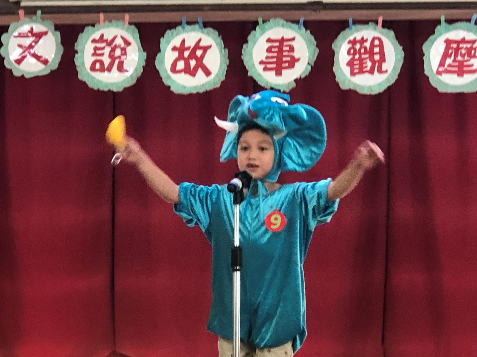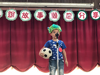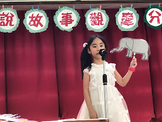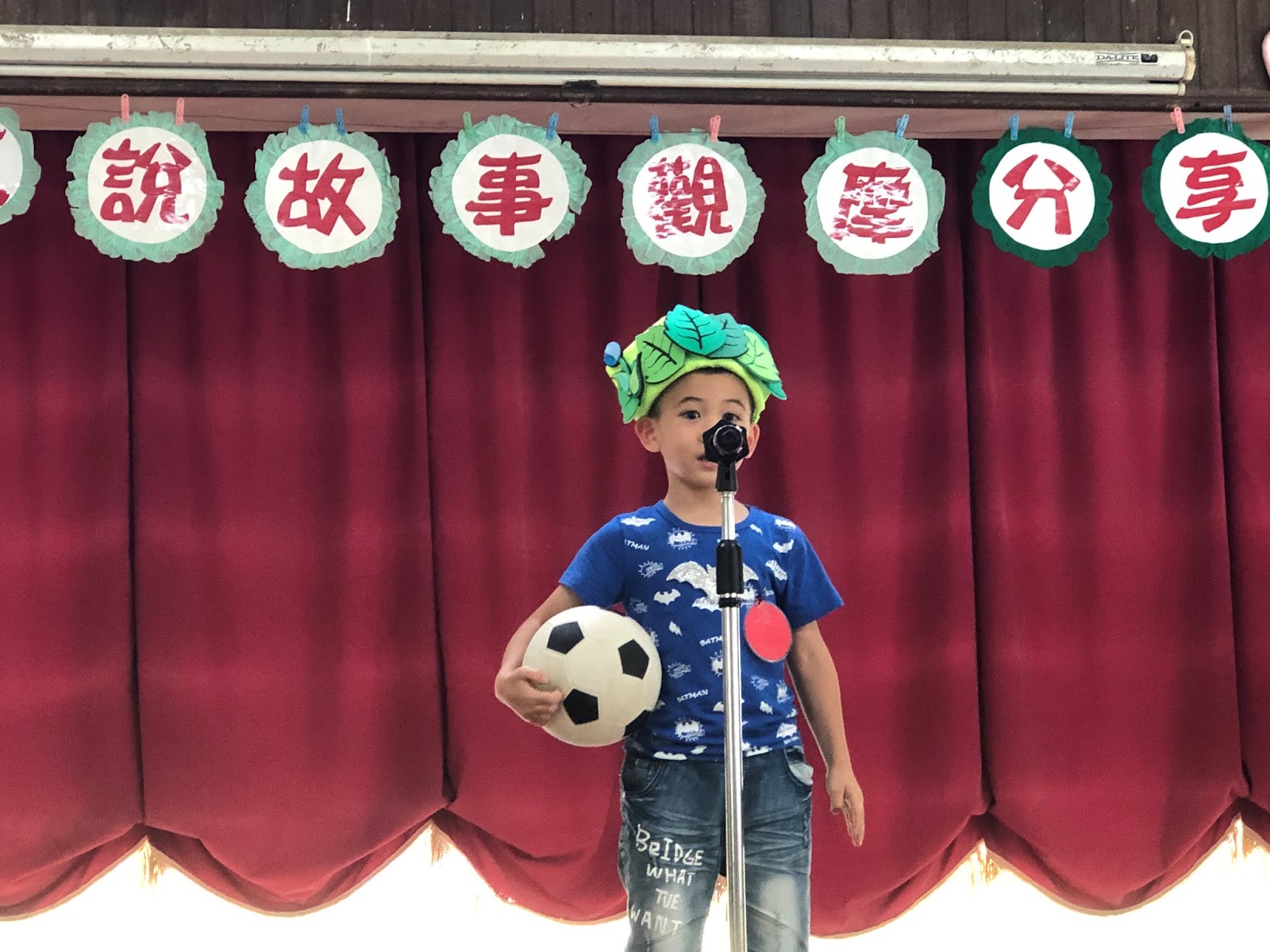 為何大中小班小孩們的目光、焦點都能放在舞台上?也許是被柔和的聲音所吸引,也許是羨慕她為何能用英文說這麼流利的故事,也或許目光是在看一旁的道具;也有可能是現場沒有說話聲,自然的小孩就不敢出聲;不論是何種原因,總之,就是能靜下心坐在椅子上,安靜片刻,這樣的態度,對台上的小朋友而言,可是一種鼓勵與肯定的表現。