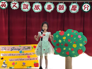台上的睿瑜態度從容,以著柔和又甜美的聲音,音量適中,順暢且自然的英文,述說著愛心樹的故事;此時,台下的小朋友們,雖然聽不懂,卻也能安靜不出聲的坐在椅子上,實在是令人好奇,此刻的他們,小腦袋瓜裡不知在想些甚麼?