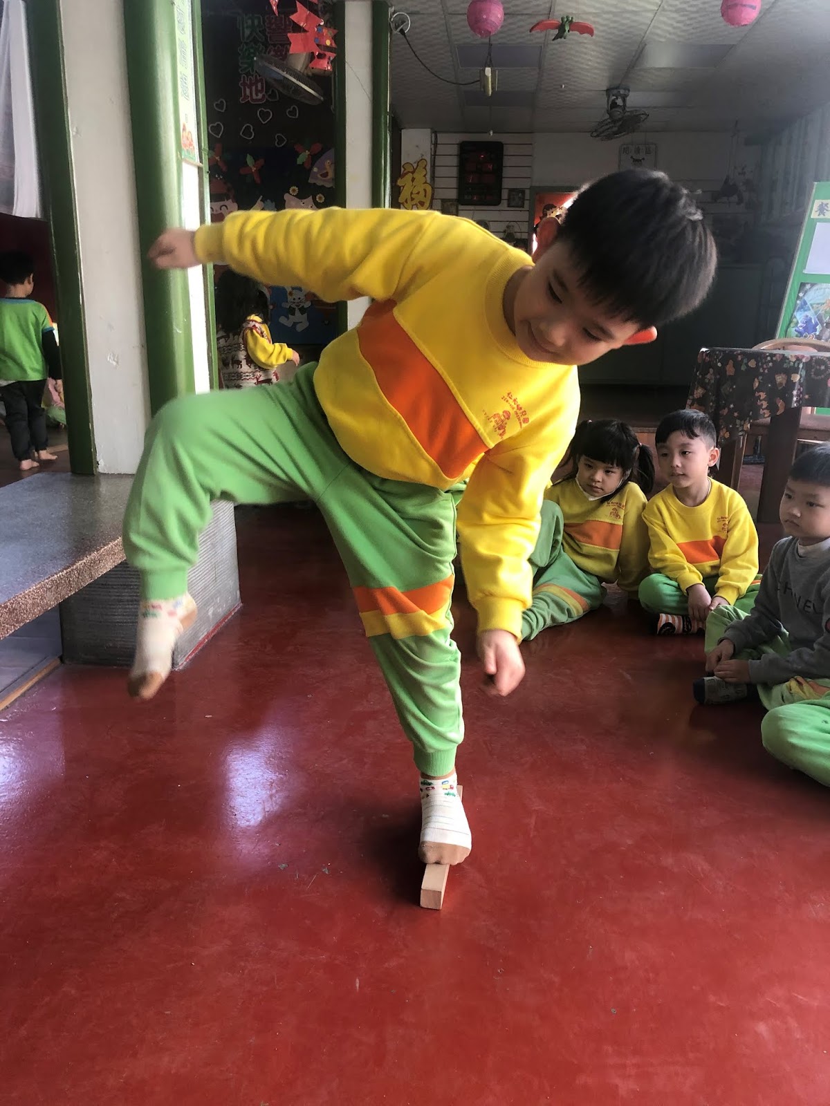 活動室集合音樂響起,孩子們一個個魚貫而入走到自己熟悉的位置,並隨著音樂舞動著身體,個個精神抖擻且面帶笑容,期待著有上台的機會;看著一張張童稚純真可愛的臉,正不知該請誰上台帶動作,突然眼睛被睿玹身上閃亮亮的蝙蝠俠圖案所吸引,於是請他上台,並邀請衣服有圖案的小朋友上台,一時間出現了麵包超人、恐龍、蜘蛛人、公主….等,哇~好可愛哦,圖案大會師,園長也藉機分享畫圖時,衣服可設計不同的花樣。