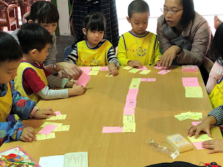 「大欉榕仔好架勢,頭戴一頂大草笠,嘴鬚長甲墬落地,逐家叫伊榕仔伯,囡仔樹腳覕相找,大人行棋講笑詼。」一首描述大榕樹的囝仔歌,請大家一起吟念,只聽到康乃爾家幾個小朋友的聲音,其他小孩還不熟,於是帶著他們一句句的念著,也挑了幾句考考他們對台語詞句的理解有多少。