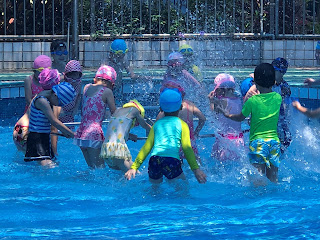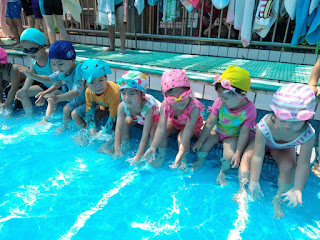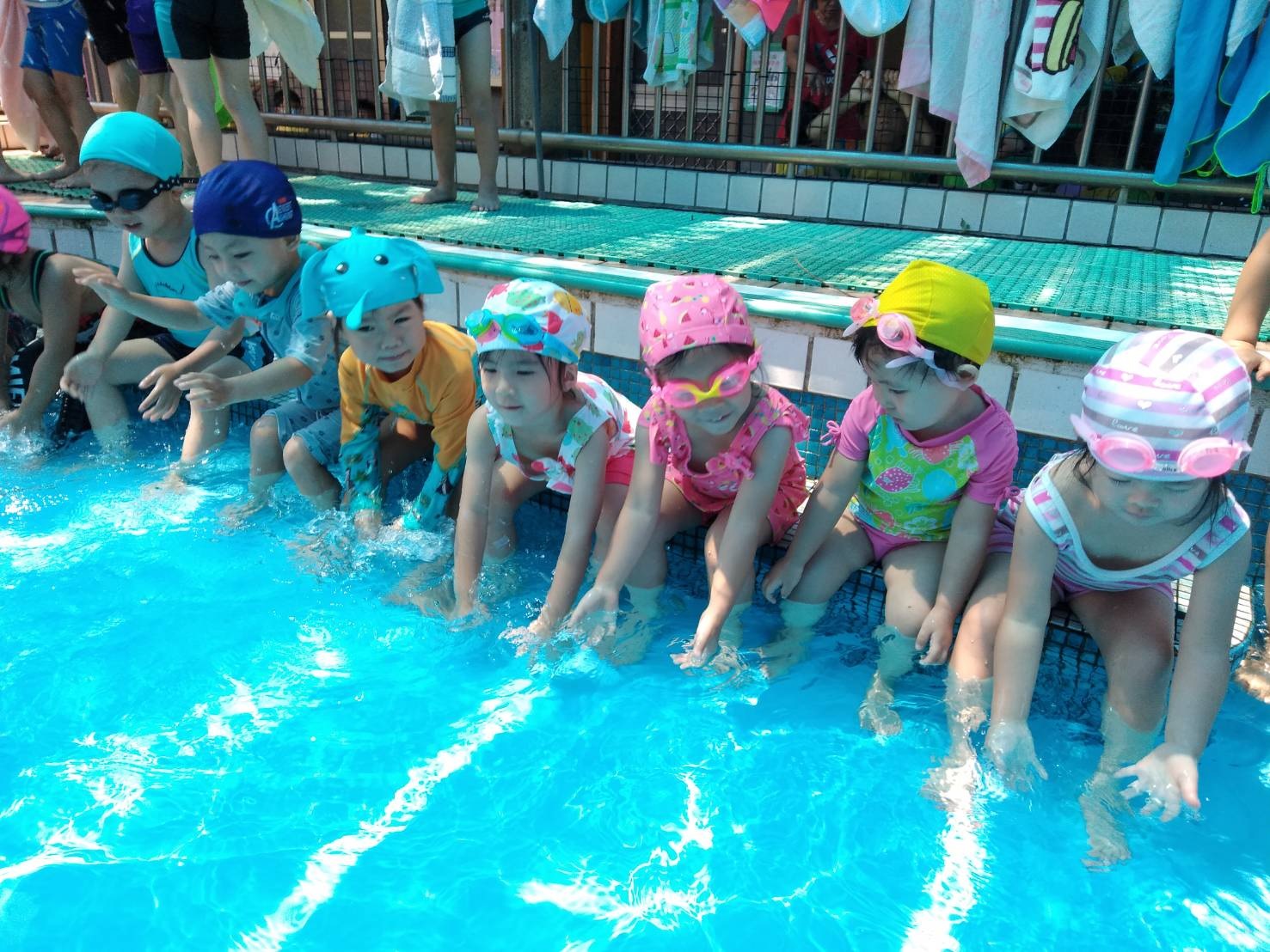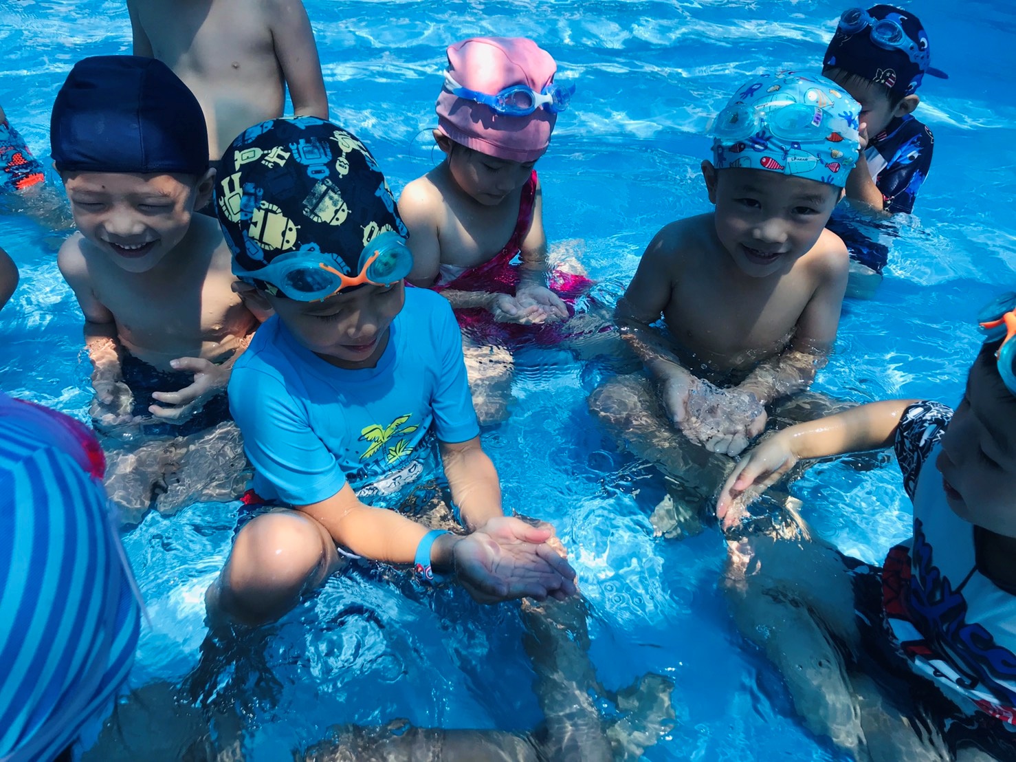 今早終於放晴,孩子們享受入泳池玩水的樂趣。