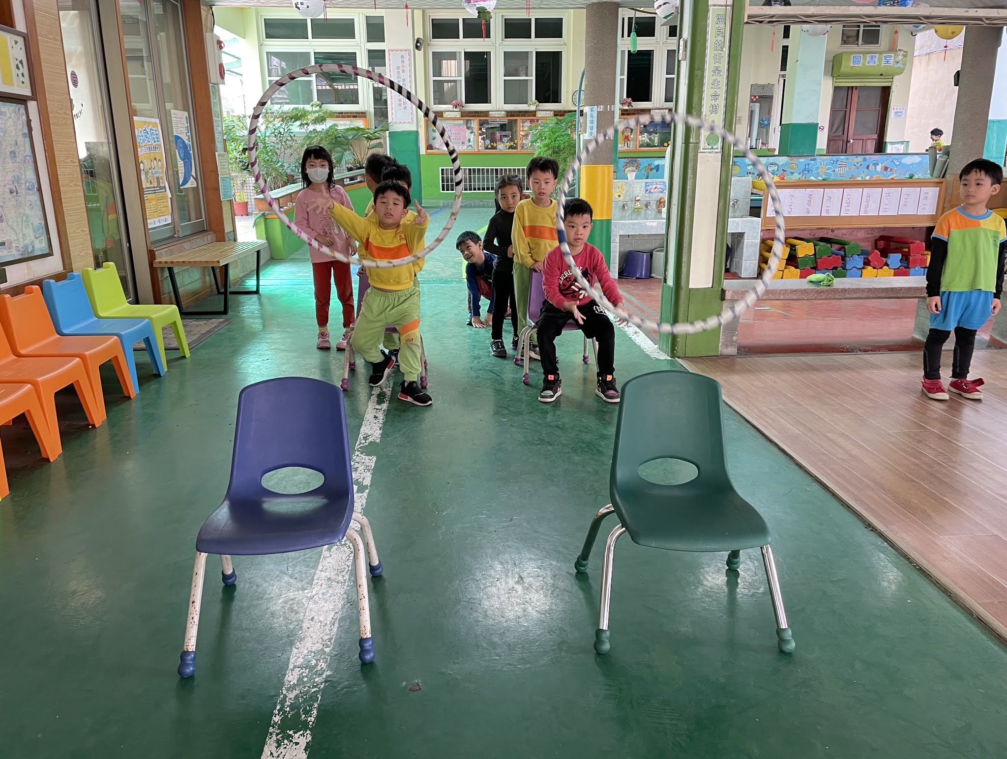 習慣兒歌第一、二週~早睡又早起-按時上床睡眠足,不需爸媽來催促;早早起床活力足,學習遊戲有幫助。就早睡早起和小孩們做分享,時間的安排也告訴他們,三到五歲小孩每天要睡十小時,晚上九小時,午睡一小時,合計10小時,睡眠不足可是會變成小矮人的~孩子們哈哈大笑。