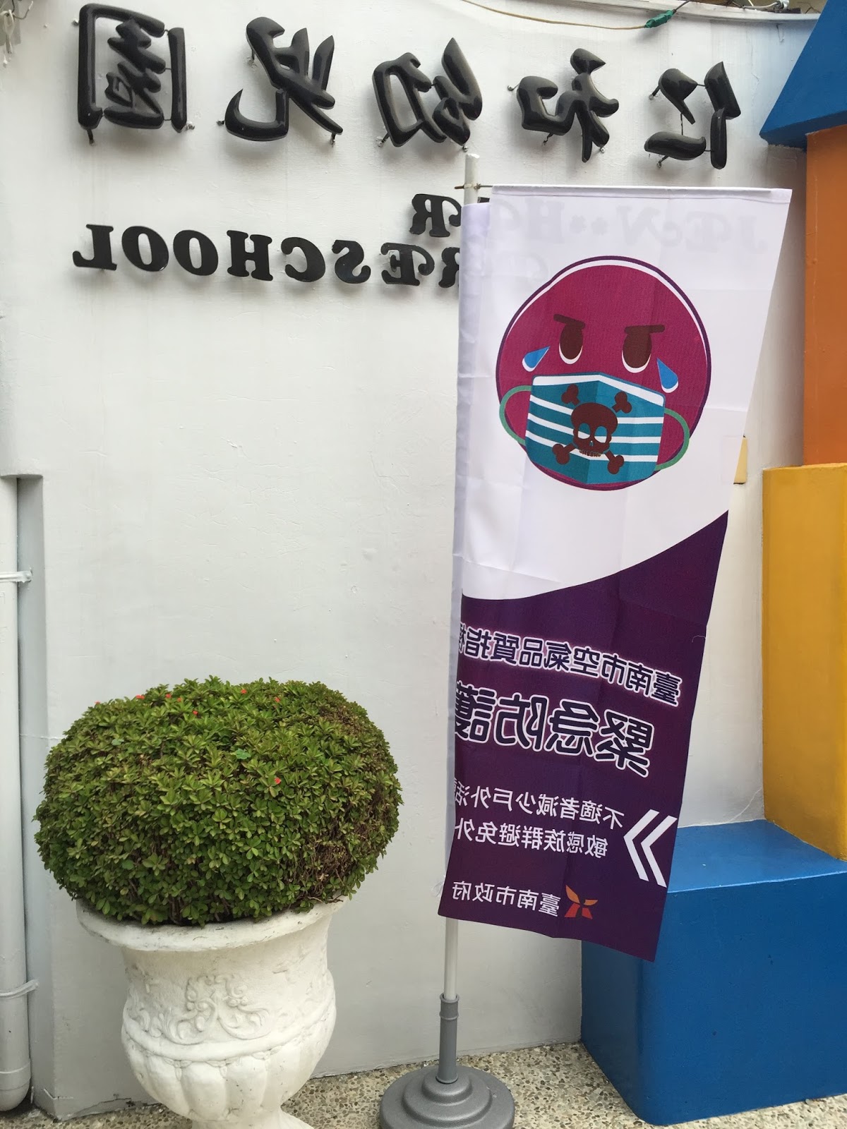 九月底研習,做宣導後,十月開始實施。每早,行政老師需先上網查閱空氣品質的指標,再依指標放置旗幟,讓師生家長及附近鄰居透過旗幟,了解空氣品質的好壞,做好自我的防護。下午回家前再將旗幟收好。