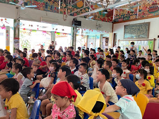 就五月的讀經或飲食問小朋友,何謂「或飲食、或坐走」「長者先、幼者後」?哈~全被問倒了,意思是不論用餐、就坐或行走,都要讓年長者先。