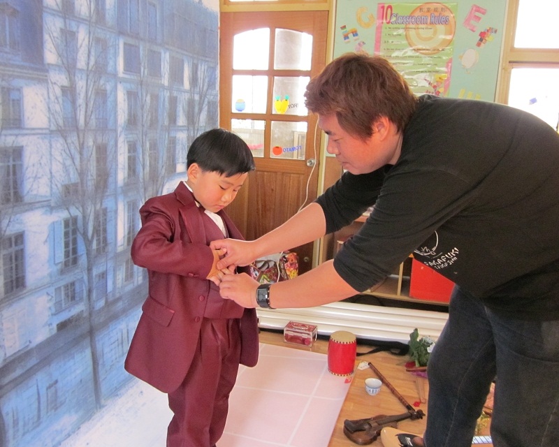 本星期大班小朋友拍攝畢業藝術照,攝影公司的老闆,為了讓拍攝過程能順利且有效率的進行,利用星期假日到幼稚園,將佈景、道具、燈光等拍攝需用的器材,事先架設在教室裡。