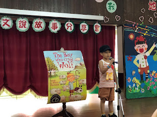 英文故事分享賽每班三個,有的少於三個,缺少挑戰的心,勇氣湯也喝得太少;上台分享的大班、中班以故事為主,小和幼則為兒歌吟念;大班-中班-小班-幼班依序上台,抽籤決定順序,分享開始,第一位睿楨、第二位珮宸表現令人稱讚,台風穩健,態度自然,口齒清晰、敘述流暢又有道具,強棒出擊,帶動了後面參賽的小朋友。