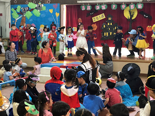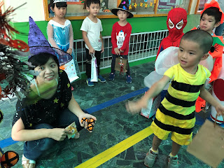 週四,因著萬聖節的到來,舉辦了「就是愛搞怪的變裝秀活動」,讓孩子們藉著活動,打扮成他們所嚮往的角色,滿足孩子的心,有美國隊長、愛紗公主、蜘蛛人、超人、海盜、蝙蝠俠、木乃伊、警察、南瓜、消防員、動物昆蟲,還有自製的恐龍..等。有的前一天就將服裝、道具提前放在幼兒園;有的是當天拿來;有的是直接穿來;不僅孩子期待,連家長也是,有許多家長前來觀賞,讓活動更顯熱鬧。