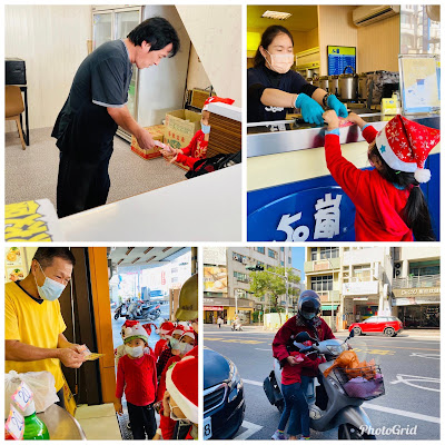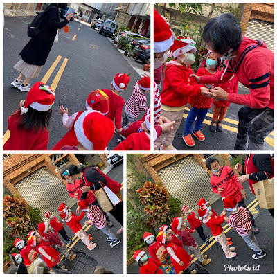週四,小朋友們扮演聖誕小天使,到社區報佳音,贈送愛的禮物-小卡片,祝大家聖誕快樂、平安喜樂;小孩們穿著紅上衣、戴紅帽,所到之處受到熱烈歡迎,舉凡公所、銀行、診所、店家、市場等,有許多人回贈小禮物,有的因身邊沒東西而感到歹勢,哈哈~大家都因為小孩們太可愛了。寶貝們快快樂樂出門、平平安安回到幼兒園,又是一次美好的體驗。