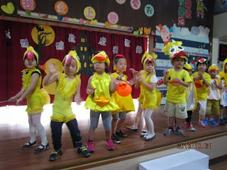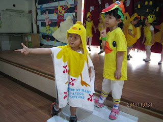 為配合活動主題,買了一隻小鴨,戴了萬聖節的帽子、配上領帶,擺在活動室入口處,可愛的模樣吸引了小朋友,三五成群的圍觀,加上周邊佈置-南瓜燈,寶貝們好興奮。也難怪昱齊會脫口而出說「看小鴨不必到高雄,在仁和就可以了。」