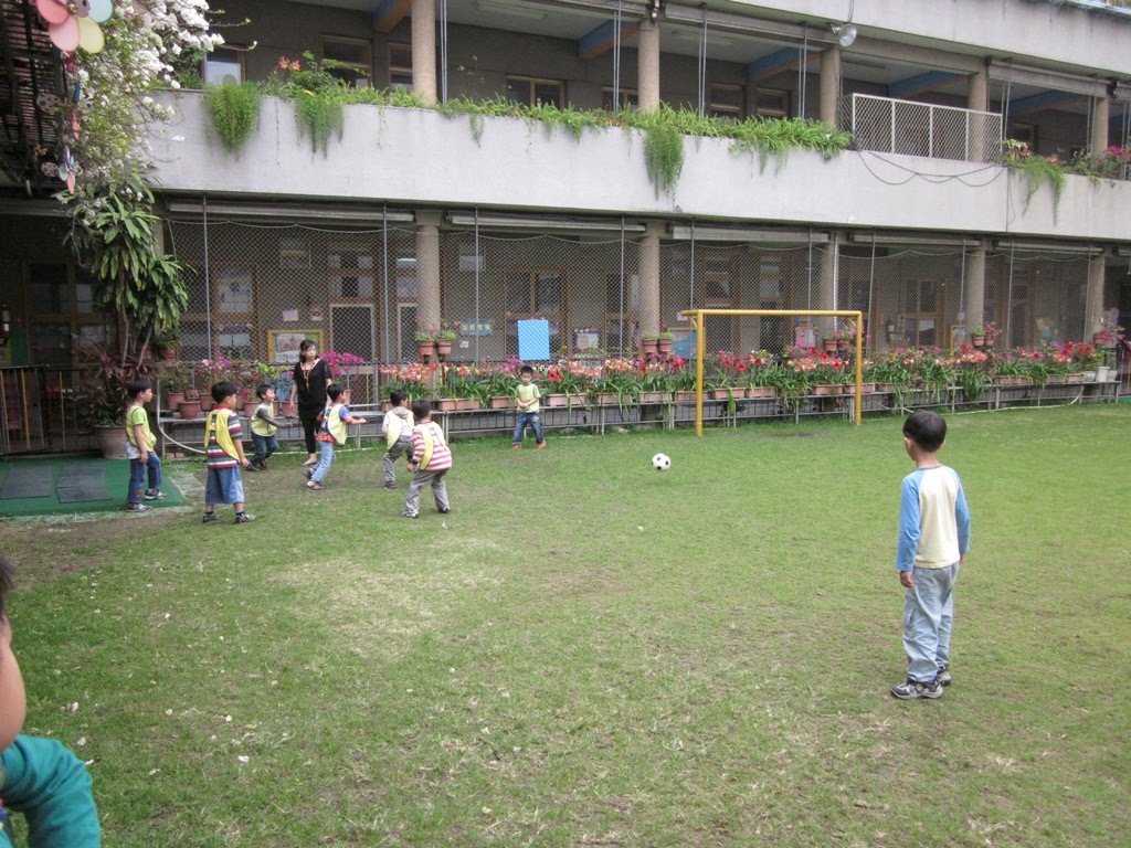 望著一群在草場上踢球的大班孩子,個個專注於場上的一顆球,球到哪,大夥兒也跟到哪,大家擠成一團,幾隻腳爭著搶球,突然球被踢走了,只見擔任裁判的Kitty媽咪吹著哨聲~邊線球~,大夥兒又往發球的地方跑….。孩子們有用不完的體力與精力,一早來園享受玩足球的樂趣,真好!