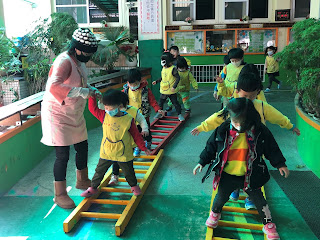 週四,假期後第一個上課日,除了肺炎的效應加上冷颼颼的天氣,一早電話響個不停,請假的孩子暴增,不是請病假反倒是事假的占九成以上,且中、大班請假的人數比小、幼班還多,來園的小朋友也都配戴口罩,通過門口老師的量體溫與手部的消毒。