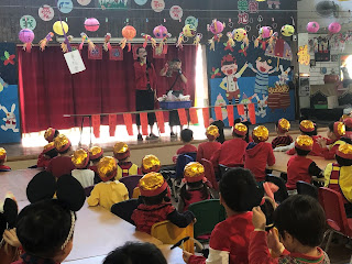 今天是農曆年前最後一個上課日,為迎接即將到來的春節,舉辦歡樂過春節活動,負責的老師們用心的計畫,有鬥年獸的舞台劇、應景食物的介紹、吉祥話、寫春聯、合唱、舞龍舞獅、敲鑼打鼓和團圓餐會,擔心帶來的餐食冷了不好吃,不怕麻煩的去借了外燴使用的保溫餐具。