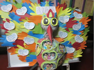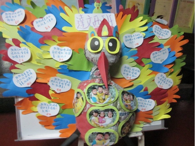 「感恩的心,感謝有妳/你」,在感恩的季節,感恩的時刻,仁和營造感恩的氛圍,引領孩子們進入感恩之門,感受感恩的情境、感恩的言語和感恩的行動~與爸媽一起製作感恩卡,寫上對人、事、物的感謝;製作大 小 心心相連,表達對父母的謝意;製作感恩小卡,送給社區人士、父母、阿公、阿媽;與好朋友合影,互說感謝的話-謝謝你陪我玩、謝謝你說故事給我聽、我愛你…,簡單的話語,表達對朋友的謝意,老師媽咪將他們的話做記錄並製成一隻大火雞。