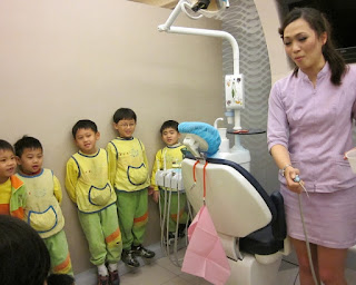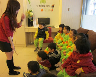 星期二莫札特、達文西、華盛頓三班小朋友到位於民權路的「立潔牙醫診所」做校外口腔教學,在診所院長、醫生、護士阿姨親切的招呼與介紹下,孩子們更加了解到牙齒保健的重要,知道一天至少要刷牙兩次,尤其是晚上睡覺前;美麗的護士阿姨透過各項牙齒診療儀器,一一介紹治療流程;醫生親切的態度袪除孩子看牙齒的恐懼心理,每個人都張大嘴巴做檢查;有獎徵答的阿姨是仁和畢業的,多了一份親切感,孩子們搶著回答問題。檢查結果蛀牙的小朋友佔六成,比例相當高,請家長一定要帶去給醫生複診,定期檢查,確保寶貝們牙齒的健康。