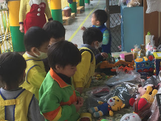 因著聖誕節來臨,園裡的布置營造了聖誕的氣氛,孩子的心情也更聖誕,加上跳蚤市場攤位物品的陳列,使他們心更雀躍,成為近日討論的話題;每天任何時段都可見三五成群的小朋友佇足在攤位前,把玩著所想要的東西,因為園長、老師有交代,不是自己的東西不可以拿,所以雖然老闆老師不在場,寶貝們也都能謹守分寸,不逾矩,看完就會放回去,等爸媽來園時,商量後再購買。