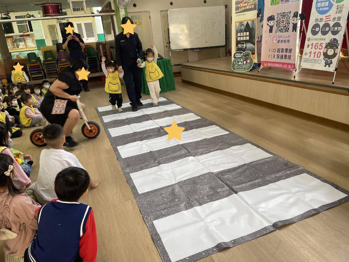 週四台南市第一分局警察哥哥和二位警察姊姊來園進行安全課題的宣導-交通安全(行人走斑馬線過馬路,要舉手用走的不能跑)、婦幼人身安全(陌生人與自我身體的保護-身體5個地方不能讓人亂碰與摸),認識警察的裝備,乘坐警車,巧扮小警察等,透過實際演練,師生獲益良多,警察哥哥姐姐親切的態度,擄獲了小朋友們的心。