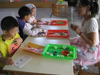 星期四小朋友們興高采烈的裝扮成自己最喜歡的卡通人物,小女生以公主、小天使、蝴蝶仙子居多;男生則以蜘蛛人居多,還有南瓜、王子、鬼、巫婆….等。活動室的舞台除了壁面佈置外,也將南瓜車搬上台當佈置。上午10時熱熱鬧鬧的由主持人Teacher Michelle揭開活動的序幕,小朋友一班班的上台走秀,每個人的扮相,像磁鐵般的吸住了台下小朋友和老師的目光,尤其是老師,相機的焦點對準了孩子,不停的按著快門,特別是Mandy,深怕一個不留神,錯失了美好的畫面;戲劇表演-糖果仙子,徵召了自願參加的12位大班小朋友,3天各20分的排演,表現值得鼓勵;過關遊戲,孩子們很喜歡,三關都以瓶蓋來進行,有瓶蓋釣釣樂、瓶蓋疊疊樂、瓶蓋拼拼樂,三關都通過就可以戳戳樂。
