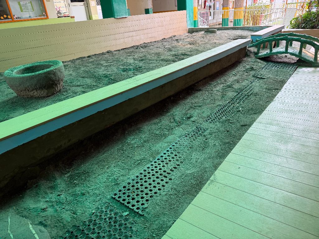 「活動室」的牆面重新鋪上了溫潤的新木板,同時也將沙坑四周的牆面加上了木板防護。 工程進行期間,園長到場開關門兼「督工」,看著師傅們揮汗如雨。幸好工程非常順利,在短短兩個太陽天內就大功告成,能這麼有效率,是因為我們早在一個月前就與工程公司敲定好施工日期,老闆也提前調度好人力,才能如期完工。