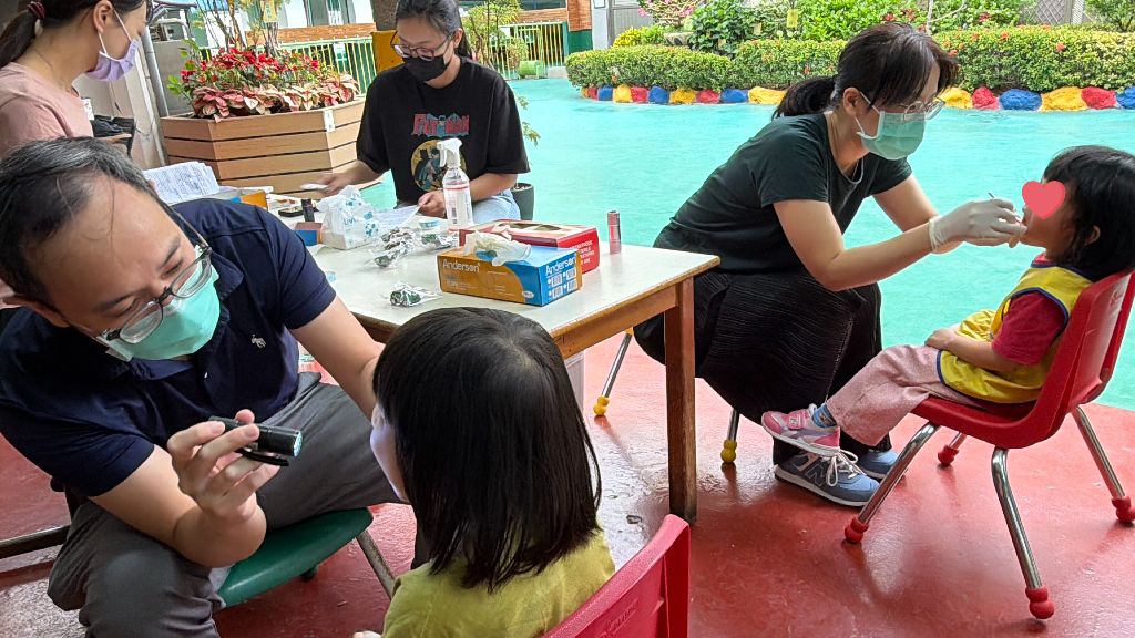 學期第一天二月二日,配合衛生局視力篩檢活動,由專業眼科醫師來幼兒園,為108、109年次同意篩檢的小朋友,點散瞳、透過儀器進行視力篩檢;篩檢的結果有疑似近視需做複檢的,由醫生開轉介單,請家長帶小朋友去做複檢。